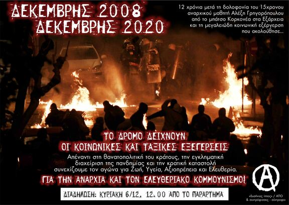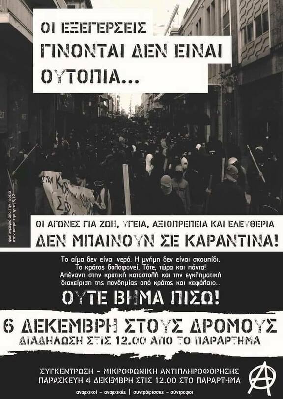 Η φετινή 6η Δεκέμβρη, λαμβάνει χώρα σε μια περίοδο σοβαρής υγειονομικής κρίσης, μια περίοδο που έχουν επιβληθεί από την εξουσία σκληρά μέτρα πειθάρχησης, ελέγχου και καταστολής, με πρόφαση την αντιμετώπισης της πανδημίας του Covid-19. Είναι φανερό ότι από την αρχή το κράτος έχει διαχειριστεί με εγκληματικό τρόπο την πανδημία, καθώς αντί να στοχεύσει στην αντιμετώπιση της και την προστασία της κοινωνίας (ενίσχυση του ΕΣΥ, πρόσληψη ιατρονοσηλευτικού προσωπικού, μαζικά τεστ), δεν έχει λάβει κανένα ουσιαστικό μέτρο για την προστασία της ανθρώπινης ζωής, με αποτέλεσμα να φτάσουμε σε σημείο να μετράμε εκατοντάδες νεκρούς την ημέρα και να γίνεται διαλογή ασθενών στα νοσοκομεία. Βασικός υπαίτιος για όλους αυτούς τους θανάτους είναι το ίδιο το κράτος, το οποίο σαν να μην έφτανε αυτό, χρησιμοποιεί την υγειονομική κρίση προκείμενου να εδραιώσει περαιτέρω την κυριαρχία του και να επιτεθεί στους από τα κάτω με μια σειρά από αντικοινωνικά νομοσχέδια (εκπαίδευση, περιβάλλον, εργασιακά, διαδηλώσεις) και πρακτικές (όπως οι εκκενώσεις καταλήψεων και η ένταση του εγκλεισμόύ των προσφύγων και των μεταναστών).
