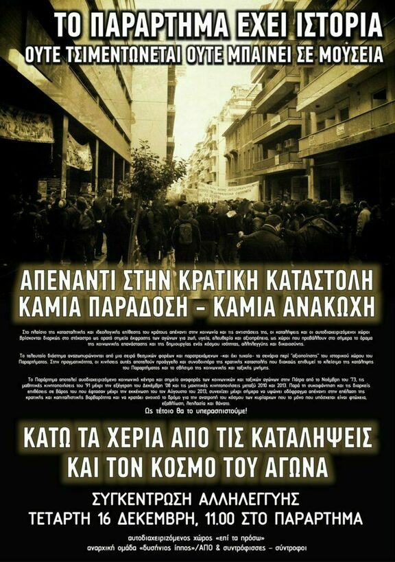 Το τελευταίο διάστημα αναζωπυρώνονται από μια σειρά θεσμικών φορέων και παρατρεχάμενων -και όχι τυχαία- τα σενάρια περί «αξιοποίησης» του ιστορικού χώρου του Παραρτήματος. Στην πραγματικότητα, οι κινήσεις αυτές αποτελούν προάγγελο και συνοδοιπόρο της κρατικής καταστολής που διακαώς επιθυμεί το κλείσιμο της κατάληψης του Παραρτήματος, καθώς και το σβήσιμο της κοινωνικής και ταξικής μνήμης.