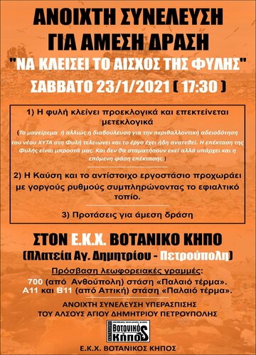 2) Η Καύση και το αντίστοιχο εργοστάσιο προχωράει με γοργούς ρυθμούς συμπληρώνοντας το εφιαλτικό τοπίο τοπίο (Χωματερή Άνω Λιοσίων - Φυλής, Eργοστάσια Mηχανικής Aνακύκλωσης και Kομποστοποίησης (ΕΜΑΚ) Ι και ΙΙ, Εργοστάσιο Καύσης Νοσοκομειακών και Ιατρικών Αποβλήτων, δύο εργοστάσια καύσης του βιοαερίου των απορριμμάτων, Εργοστάσιο Διαλογής Ανακυκλώσιμων Υλικών (ΜΔΑΥ), εγκαταστάσεις του Οργανισμού Διαχείρισης Δημόσιου Υλικού (ΟΔΔΥ), τα δύο νέα σχεδιαζόμενα εργοστάσια διαχείρισης απορριμμάτων, κολώνες υπερύψηλής τάσης, αμαξοστάσιο του Οργανισμού Αστικών Συγκοινωνιών Αθηνών, στρατόπεδα, κλπ.).