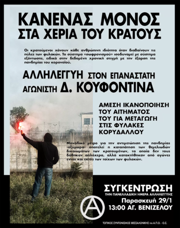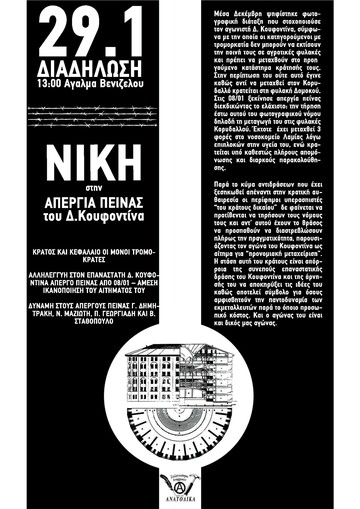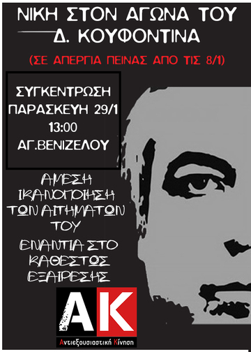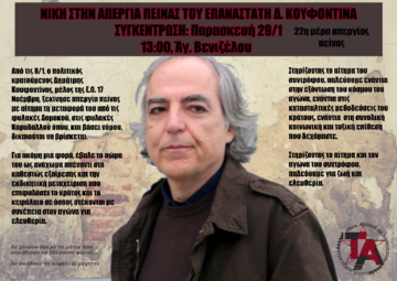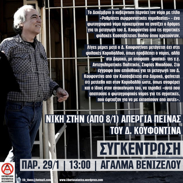 Συγκέντρωση αλληλεγγύης στον απεργό πείνας Δημήτρη Κουφοντίνα, Παρασκευή 29/1 στις 13:00, Άγαλμα Βενιζέλου.