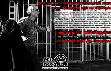 Όσο και να μας προσπαθούν να πείσουν ότι τρομοκράτες είναι όσοι στοχοποιούν τους εξουσιαστές οι φτωχοί κι όσοι περισσεύουμε σ'αυτή την κοινωνία, δε φοβόμασταν ποτέ τη 17 Νοέμβρη. Φοβόμαστε το ότι τον επόμενο μήνα δε θα βγαίνει το νοίκι και το ότι μπορεί να ξαναείμαστε άνεργοι άμα διεκδικήσουμε τα νόμιμα στις δουλειές μας, το ότι τα παιδιά μας στοιβάζονται στις τάξεις και το ότι δε μας φτάνουν τα φράγκα για τις εξετάσεις στα ιδιωτικά διαγνωστικά κέντρα και τις κλινικές. Φοβόμαστε για τα πιτσιρίκια που κυκλοφορούν στην πλατεία να μη βρεθούν μπροστά στους μπάτσους, φοβόμαστε για το ότι οι ορέξεις της ντόπιας αστικής τάξη μπορούν να μας μπλέξουν σε κάναν πόλεμο που θα πάμε να σκοτωθούμε πάλι εμείς, οι περιττοί, οι αναλώσιμοι, οι προλετάριοι. Μπροστά σε μια νέα κρίση που θα κληθούμε πάλι να βάλουμε πλάτη για να σωθούν τα αφεντικά, μπροστά σε μια νέα κλιμάκωση της επίθεσης απέναντι σε όσους αντιστέκονται, ο Δημήτρης Κουφοντίνας αποτελεί σύμβολο για τους καταπιεσμένους απέναντι στο κλίμα φόβου που καλλιεργείται. Και ο αγώνας του είναι και δικός μας αγώνας. Για αυτό την Παρασκευή 29/01 καλούμε όλους όσους και όσες δε δέχονται να μένουν άπραγοι απέναντι στη δολοφονική πολιτική του ελληνικού κράτους σε συγκέντρωση αλληλεγγύης στον απεργό πείνας Δ. Κουφοντίνα.