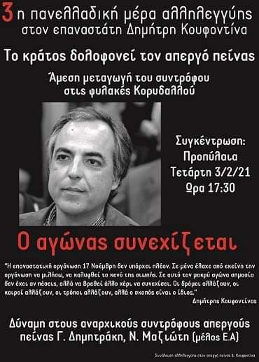 Καλούμε στην πανελλαδική μέρα δράσης αλληλεγγύης στον απεργό πείνας Δημήτρη Κουφοντίνα, την Τετάρτη 3 Φλεβάρη,