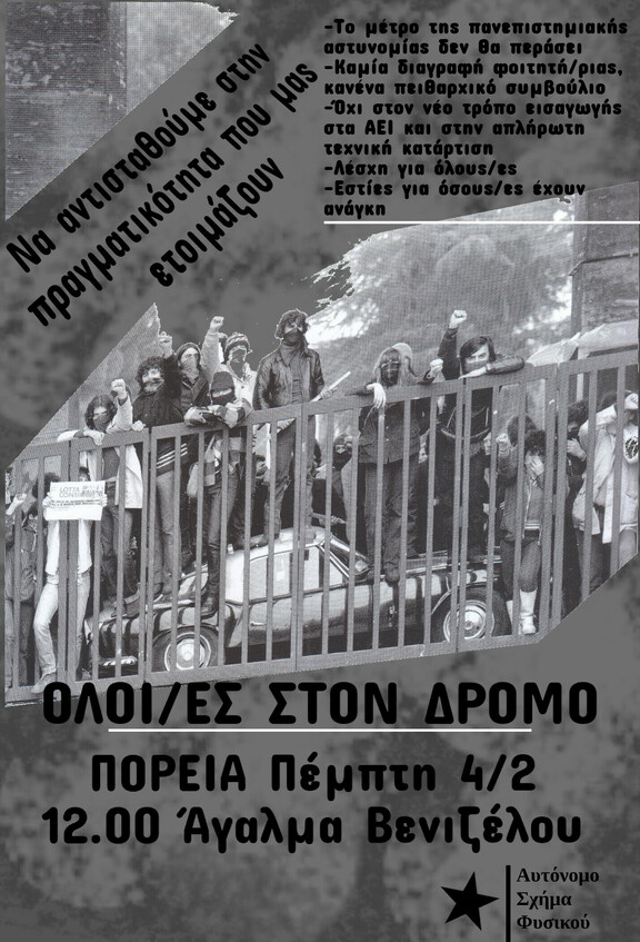 Οι κοινωνικές δυναμικές που εκδηλώνονται στο δρόμο φανερώνουν ότι όλο και ευρύτερα κομμάτια των καταπιεσμένων αντιλαμβάνονται την ανάγκη της ρήξης με τα συμφέροντα του κεφαλαίου στην πράξη. Σαν ένα κομμάτι της κοινωνικής βάσης και ενός κινήματος που προσπαθεί να βάλει το λιθαράκι της για ένα κόσμο ελευθερίας, αλληλεγγύης και ισότητας, πιστεύουμε ότι η ανάγκη για αυτοοργάνωση των φοιτητών και των φοιτητριών στους συλλόγους τους είναι κρίσιμη όπως πάντοτε. Η επίθεση που δεχόμαστε δε μπορεί να αντιμετωπιστεί μόνο αναθέτοντας σε <<ειδικούς>> την πολιτική δράση, αλλά αντιθέτως λαμβάνοντας καθένας και καθεμία τις ευθύνες που μας αναλογούν ώστε να πάρουμε τις ζωές στα χέρια μας. Ας δομήσουμε τις απαραίτητες σχέσεις αλληλεγγύης και αξιοπιστίας ανάμεσά μας και ας αναζωπυρώσουμε αυτές που έχουν παγώσει, ώστε να ξεκινήσει ακηδεμόνευτα και μαχητικά η αντεπίθεσή μας.