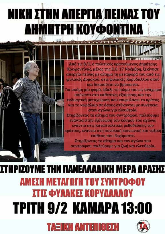 Στις 8/1/2021 ο σύντροφος, πολιτικός κρατούμενος, Δημήτρης Κουφοντίνας, μέλος της Ε.Ο. 17 Νοέμβρη, ξεκίνησε απεργία πείνας ενάντια στην εκδικητική μεταχείριση του από την κυβέρνηση και τους διωκτικούς μηχανισμούς, οι οποίοι παραβαίνοντας ακόμα και τους δικούς τους αστικούς νόμους αρνούνται να τον μεταφέρουν από τις φυλακές Δομοκού, στις φυλακές Κορυδαλλού όπου και δικαιούται να βρίσκεται με βάση τον φωτογραφικό νόμο που ψήφισε εις βάρος του η κυβέρνση της ΝΔ.