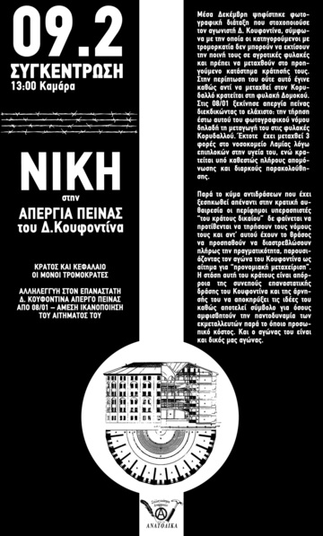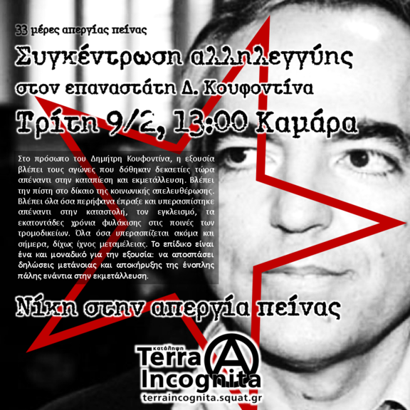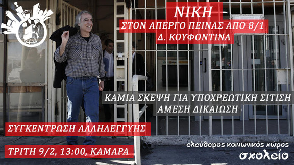 Συγκέντρωση αλληλεγγύης στον απεργό πείνας Δημήτρη Κουφοντίνα, Τρίτη 9/2 στις 13:00, Καμάρα.