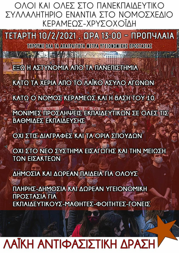 Μέσα σε αυτή την κατάσταση, αποτελεί καθήκον κάθε οργανωμένης δύναμης του λαϊκού κινήματος, συνολικά του εργαζόμενου λαού, να αντισταθεί απέναντι στα αντεργατικά- αντιλαϊκά νομοσχέδια της Κεραμέως και στην πολιτική της κυβέρνησης που εντείνει ακόμη περισσότερο τους ταξικούς φραγμούς για τα παιδιά των εργατικών- λαϊκών οικογενειών και τους εργαζόμενους φοιτητές νεολαίους. Μέσα από ένα μέτωπο εκπαιδευτικών- γονιών- φοιτητών- μαθητών να ορθωθεί τοίχος και να πέσουν τα αντιδραστικά νομοθετήματα του Υπουργείου Παιδείας, από κοινού με ριζοσπαστικές- λαϊκές διεκδικήσεις για καθολικά μέτρα υγειονομικής προστασίας και περίθαλψης των εκπαιδευτικών- των γονιών- των μαθητών και των φοιτητών όσο συνεχίζεται η υγειονομική κρίση.