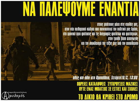 Τετάρτη 10/2 στη 13:00 και την ώρα ψήφισης του νομοσχεδίου (απογευμα) πορείες ενάντια στην εκπαιδευτική αναδιάρθρωση, την πανεπιστημιακή αστυνομία, την καταστολή των αγώνων μας και περαιτέρω υποβάθμιση των ζωών μας