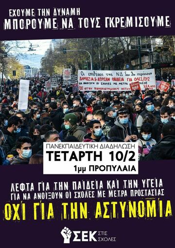 Μέσα στο πλαίσιο της απαγόρευσης των συγκεντρώσεων και διαδηλώσεων, της ποινικοποίησης της πολιτικής- κινηματικής δράσης με πρόσχημα την πανδημία για τις ανάγκες της εξαρτημένης άρχουσας τάξης, η κυβέρνηση παίρνοντας τα ηνία από την κυβέρνηση ΣΥΡΙΖΑ που άνοιξε τον δρόμο συνεχίζει την ταξική- εκπαιδευτική αναδιάρθρωση με σειρά αντιλαϊκών- αντεργατικών νόμων λαιμητόμων που χτυπούν την δημόσια και δωρεάν εκπαίδευση, εντείνοντας τους ταξικούς φραγμούς στην παιδεία, πραγματοποιώντας μια συνολική επίθεση στο δικαίωμα στην εκπαίδευση των παιδιών των φτωχών εργατικών- λαϊκών οικογενειών. Οι μαζικές πανεκπαιδευτικές πορείες των τελευταίων εβδομάδων αποδεικνύουν πως οι μαζικές-λαϊκές πορείες και συγκεντρώσεις καταρρίπτουν στην πράξη το σχέδιο της κυβέρνησης για απαγόρευση των διαδηλώσεων-διεκδικήσεων και δίνουν αγωνιστικό μήνυμα συνέχισης των εργατικών-λαϊκών κινητοποιήσεων απέναντι στη κρατική τρομοκρατία υπερασπίζοντας τις εργατικές-λαϊκές κατακτήσεις και τα δημοκρατικά δικαιώματα. Οι μαζικoί- λαϊκοί-πολύμορφοι- μαχητικοί αγώνες αποτελούν τον δρόμο για να εναντιωθούμε στο καπιταλιστικό-ιμπεριαλιστικό σύστημα και την φασιστική- κρατική-παρακρατική τρομοκρατία.