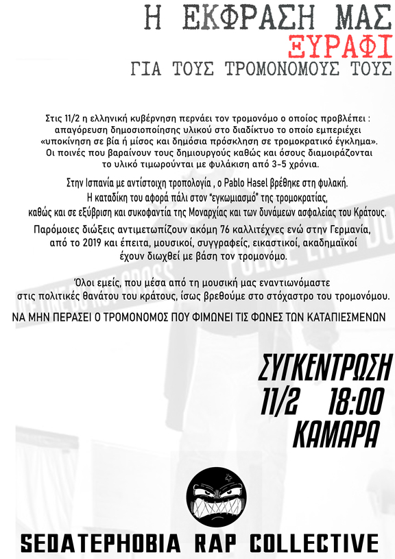 Αυτό το νομοσχέδιο προς ψήφιση δε μας προκαλεί καμία έκπληξη. Στην ισπανία με αντίστοιχη νομοθεσία έχουν γίνει 76 διώξεις και σε αρκετούς έχουν αποδοθεί ποινές φυλάκισης, όπως ο αγωνιστής ράπερ Πάμπλο Χασέλ που καλείται να παραδοθεί στις αρχές ως τις 12 φλεβάρη με ποινή 2 χρόνια φυλάκισης. Με βάση τον ίδιο τρομονόμο, από το 2019 στη γερμανία διώκονται καλλιτέχνες, συγγραφείς και ακαδημαϊκοί. Για παρόμοιους λόγους έχουν φυλακιστεί πολλά μέλη της μπάντας Grup Yorum στην Τουρκία. Όπως βλέπουμε παρατηρείται ένα παγκόσμιο μοτίβο στην πολιτική αντιμέτωπιση κάθε φωνής που αντιστέκεται στην κυρίαρχη αφήγηση. Το ελληνικό κράτος συνεπές στο να στήνει σκευωρίες σε βάρος αγωνιστών, μπορούμε μόνο να φανταστούμε πως θα χρησιμοποιήσει την παραπάνω νομοθεσία, όταν αυτή ψηφιστεί.