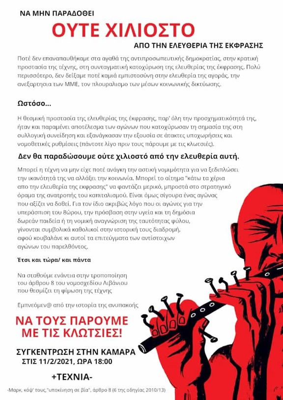 Να σταθούμε ενάντια στην τροποποίηση του άρθρου 8 του νομοσχεδίου Λιβάνιου, που θεσμίζει τη φίμωση της τέχνης.
