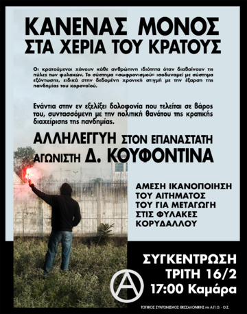 Ως αναρχικοί/ες στεκόμαστε αλληλέγγυοι στον αγώνα του Δ. Κουφοντίνα, ενάντια στις ρεβανσιστικές τακτικές του κράτους. Οφείλουμε να υψώσουμε αναχώματα στην κρατική αυθαιρεσία, να σταθούμε δίπλα σε αυτούς που διεκδικούν και αγωνίζονται.