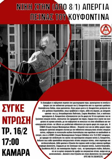 Ο κρατούμενος Δημήτρης Κουφοντίνας αντιστέκεται στη προκλητική αυτή μεθόδευση με όπλο το σώμα του και την υγεία του η οποία απειλείται άμεσα καθώς ήδη εκτίει την 14η ημέρα απεργία πείνας (ξεκινώντας στις 8-1-2021) και μέρα με τη μέρα οι εξελίξεις για τη ζωή του αποβαίνουν κρίσιμες. Το αίτημα του να μεταχθεί στη φυλακή του Κορυδαλλού που συνιστά τη πλησιέστερη προς τον τόπο κατοικίας των μελών της οικογένειας του - και συνιστά υποχρέωση κατά τον Σωφρονιστικό Κώδικα και τις ανωτέρω διατάξεις του νόμου- είναι δίκαιο και μας συναντά μαζί του στον αγώνα του.