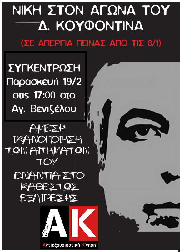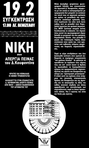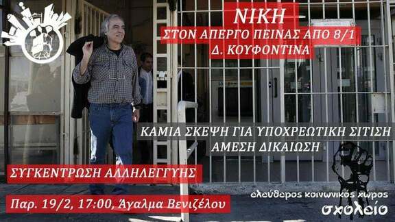 Απέναντι στην εκδικητικότητα του ελληνικού κράτους και το διαρκές καθεστώς εξαίρεσης προς το άτομό του, ο Κουφοντίνας στις 08/01 ξεκίνησε απεργία πείνας διεκδικώντας το ελάχιστο: την τήρηση έστω αυτού του φωτογραφικού νόμου που του στερεί το δικαίωμα έκτισης της ποινής του στις αγροτικές φυλακές και ορίζει ότι θα έπρεπε να μεταχθεί στο προηγούμενο κατάστημα κράτησής του, δηλαδή τις φυλακές Κορυδαλλού. Έκτοτε έχει μεταχθεί 3 φορές στο νοσοκομείο Λαμίας λόγω επιπλοκών στην υγεία του, ενώ κρατείται υπό καθεστώς πλήρους απομόνωσης και διαρκούς παρακολούθησης. Σε ένδειξη αλληλεγγύης στον δίκαιο αγώνα του έχει ξεσηκωθεί κύμα αντιδράσεων απέναντι στην κρατική αυθαιρεσία. Οι περίφημοι υπερασπιστές "του κράτους δικαίου" όμως δε φαίνεται να προτίθενται να τηρήσουν τους νόμους τους και αντ' αυτού έχουν το θράσος να προσπαθούν να διαστρεβλώσουν πλήρως την πραγματικότητα, παρουσιάζοντας τον αγώνα του Κουφοντίνα ως αίτημα για "προνομιακή μεταχείριση".