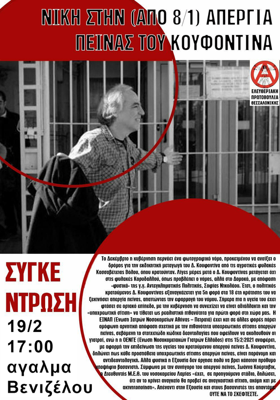 Στις 8/1/2021 ο σύντροφος, πολιτικός κρατούμενος, Δημήτρης Κουφοντίνας, μέλος της Ε.Ο. 17 Νοέμβρη, ξεκίνησε απεργία πείνας ενάντια στην εκδικητική μεταχείριση του από την κυβέρνηση και τους διωκτικούς μηχανισμούς, οι οποίοι παραβαίνοντας ακόμα και τους δικούς τους αστικούς νόμους αρνούνται να τον μεταφέρουν από τις φυλακές Δομοκού, στις φυλακές Κορυδαλλού όπου και δικαιούται να βρίσκεται με βάση τον φωτογραφικό νόμο που ψήφισε εις βάρος του η κυβέρνση της ΝΔ. Σήμερα ο απεργός πείνας βρίσκεται σε κρίσιμη κατάσταση στην εντατική.