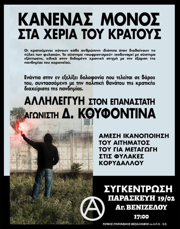 Ήδη σήμερα ο Δ. Κουφοντίνας διανύει την 43η ημέρα απεργίας πείνας με την κατάσταση της υγείας του να βρίσκεται σε κρίσιμη κατάσταση, καθώς έχει ήδη μεταφερθεί στην εντατική. Ανοικτό παραμένει το ενδεχόμενο αναγκαστικής σίτισης, το οποίο συνιστά βασανιστήριο, απο τους σύγχρονους βασανιστές και τους εντολοδόχους τους. Σε αυτόν τον αγώνα δεν είναι μόνος. Ως αναρχικοί/ες στεκόμαστε δίπλα σε αυτούς/ες που αγωνίζονται και διεκδικούν. Απέναντι στις δολοφονικές πολιτικές και στον ρεβανσισμό του κράτους, την εκκωφαντική σιωπή των καθεστωτικών ΜΜΕ, αντιτάσσουμε την αλληλεγγύη. Δεν θα αφήσουμε κανέναν αγωνιστή να θαφτεί στα κελιά της αστικής δημοκρατίας. Μέχρι το γκρέμισμα κάθε φυλακής, κανένας αγωνιστής μόνος στα χέρια του κράτους.