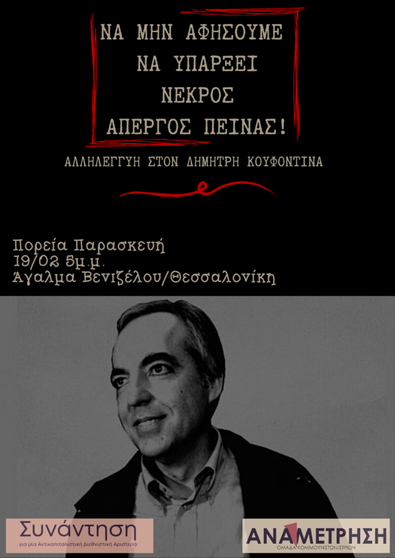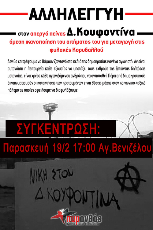 Όσο και να μας προσπαθούν να πείσουν ότι τρομοκράτες είναι όσοι στοχοποιούν τους εξουσιαστές, οι φτωχοί κι όσοι περισσεύουμε σ'αυτή την κοινωνία, δε φοβόμασταν ποτέ τη 17 Νοέμβρη. Φοβόμαστε το ότι τον επόμενο μήνα δε θα βγαίνει το νοίκι και το ότι μπορεί να ξαναείμαστε άνεργοι άμα διεκδικήσουμε τα νόμιμα στις δουλειές μας, το ότι τα παιδιά μας στοιβάζονται στις τάξεις, και το ότι δε μας φτάνουν τα φράγκα για τις εξετάσεις στα ιδιωτικά διαγνωστικά κέντρα και τις κλινικές. Φοβόμαστε για τα πιτσιρίκια που κυκλοφορούν στην πλατεία να μη βρεθούν μπροστά στους μπάτσους, φοβόμαστε για το ότι οι ορέξεις της ντόπιας αστικής τάξη μπορούν να μας μπλέξουν σε κάναν πόλεμο που θα πάμε να σκοτωθούμε πάλι εμείς, οι περιττοί, οι αναλώσιμοι, οι προλετάριοι. Μπροστά σε μια νέα κρίση που θα κληθούμε πάλι να βάλουμε πλάτη για να σωθούν τα αφεντικά, μπροστά σε μια νέα κλιμάκωση της επίθεσης απέναντι σε όσους αντιστέκονται, ο Δημήτρης Κουφοντίνας αποτελεί σύμβολο για τους καταπιεσμένους απέναντι στο κλίμα φόβου που καλλιεργείται. Και ο αγώνας του είναι και δικός μας αγώνας. Για αυτό την Τρίτη 09/02 καλούμε όλους όσους και όσες δε δέχονται να μένουν άπραγοι απέναντι στη δολοφονική πολιτική του ελληνικού κράτους σε συγκέντρωση αλληλεγγύης στον απεργό πείνας Δ. Κουφοντίνα.