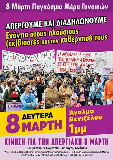 - Η οργάνωση της φετινής απεργιακής 8 Μάρτη χρειάζεται να σημάνει ξεσηκωμό στους χώρους δουλειάς, στις σχολές, στις γειτονιές. Συγκροτούμε παντού ομάδες και ξεσηκώνουμε το χώρο μας, οργανώνοντας συζητήσεις και διεκδικώντας αποφάσεις από σωματεία, ομοσπονδίες, φοιτητικούς συλλόγους για συμμετοχή στο απεργιακό συλλαλητήριο. Τέτοιες πρωτοβουλίες έχουν ξεκινήσει και απλώνονται.