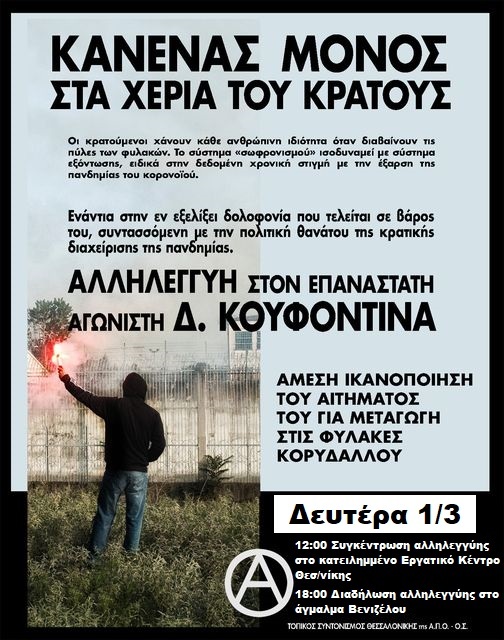 Συγκεντρώσεις αλληλεγγύης στον επαναστάτη απεργό πείνας Δ. Κουφοντίνα: