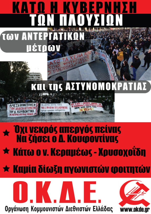 Είμαστε δύο κόσμοι σε σύγκρουση. Και αυτή η σύγκρουση δε μπορεί παρά να είναι συλλογική υπόθεση για τον κόσμο της αντίστασης και των αγώνων. Γιατί το ίδιο κράτος που οδηγεί στο θάνατο τον επαναστάτη Δ. Κουφοντίνα, τσακίζει, συλλαμβάνει και βασανίζει φοιτητές και εργαζόμενες, θάβει στο μπετό κρατούμενους και δολοφονεί μετανάστριες. Ο δικός μας κόσμος ενώνει τη φωνή και τις δυνάμεις του κάθε μέρα στους δρόμους για να απαντήσει συλλογικά. Γιατί ο αγώνας ενός, είναι συλλογικό διακύβευμα.