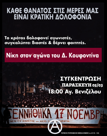 Όσο και να μας προσπαθούν να πείσουν ότι τρομοκράτες είναι όσοι στοχοποιούν τους εξουσιαστές, οι φτωχοί κι όσοι περισσεύουμε σ'αυτή την κοινωνία, δε φοβόμασταν ποτέ τη 17 Νοέμβρη. Φοβόμαστε το ότι τον επόμενο μήνα δε θα βγαίνει το νοίκι και το ότι μπορεί να ξαναείμαστε άνεργοι άμα διεκδικήσουμε τα νόμιμα στις δουλειές μας, το ότι τα παιδιά μας στοιβάζονται στις τάξεις, και το ότι δε μας φτάνουν τα φράγκα για τις εξετάσεις στα ιδιωτικά διαγνωστικά κέντρα και τις κλινικές. Φοβόμαστε για τα πιτσιρίκια που κυκλοφορούν στην πλατεία να μη βρεθούν μπροστά στους μπάτσους, φοβόμαστε για το ότι οι ορέξεις της ντόπιας αστικής τάξη μπορούν να μας μπλέξουν σε κάναν πόλεμο που θα πάμε να σκοτωθούμε πάλι εμείς, οι περιττοί, οι αναλώσιμοι, οι προλετάριοι. Μπροστά σε μια νέα κρίση που θα κληθούμε πάλι να βάλουμε πλάτη για να σωθούν τα αφεντικά, μπροστά σε μια νέα κλιμάκωση της επίθεσης απέναντι σε όσους αντιστέκονται, ο Δημήτρης Κουφοντίνας αποτελεί σύμβολο για τους καταπιεσμένους απέναντι στο κλίμα φόβου που καλλιεργείται. Και ο αγώνας του είναι και δικός μας αγώνας. Για αυτό την Τρίτη 09/02 καλούμε όλους όσους και όσες δε δέχονται να μένουν άπραγοι απέναντι στη δολοφονική πολιτική του ελληνικού κράτους σε συγκέντρωση αλληλεγγύης στον απεργό πείνας Δ. Κουφοντίνα.