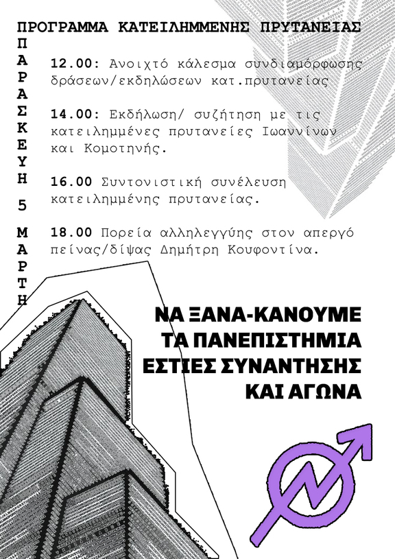 Καλούμε κάθε κάτοικο αυτής της πόλης που νοιώθει ότι ο αγώνας του απεργού πείνας Δημήτρη Κουφοντίνα αφορά πολλούς περισσότερους από τον ίδιο τον απεργό, που αντιλαμβάνεται τη σημασία να υπάρξουν ρωγμές και αναχώματα στην οξυμένη κρατική καταστολή,που ασφυκτιά από την εγκληματική, ταξική και κατασταλτική διαχείριση της πανδημίας από το κράτος να πλαισιώσει την κατάληψη του Εργατικού Κέντρου Θεσσαλονίκης για να λειτουργήσει ως κέντρο αγώνα με αιχμή την απεργία πείνας του Δ. Κουφοντίνα και να το μετατρέψουμε μαζί με την Κατειλημμένη Πρυτανεία σε εστίες συντονισμένης αντίστασης.