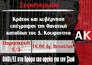 Απεργία Πείνας Δ. Κουφοντίνα: Νέες Συγκεντρώσεις Αλληλεγγύης - Παρασκευή 5 και Σάββατο 6/3
