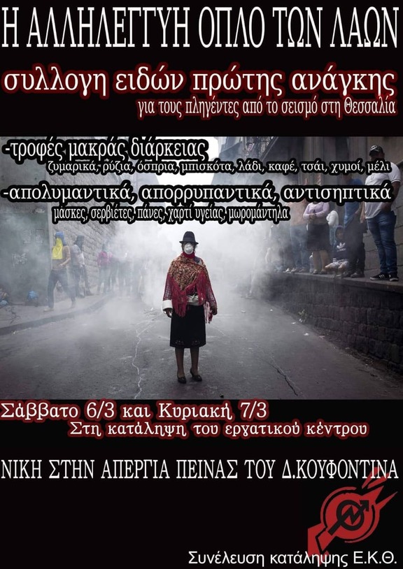 Η κατάληψη του Εργατικού Κέντρου Θεσσαλονίκης δεν είναι απλά ένα σημείο αναφοράς για την έκφραση της στήριξης στον απεργό πείνας Δημήτρη Κουφοντίνα. Η εδαφικοποίηση της ανάδειξης του αγώνα του Δημήτρη είναι μια κίνηση που οφείλει να επανανοηματοδοτήσει την πραγματική διάσταση και τα περιεχόμενα ενός από τους πιο βαρυσήμαντους πολιτικούς και κοινωνικούς όρους, αυτού της αλληλεγγύης. Το ίδιο κράτος που αδιαφορεί για τη ζωή του απεργού, γυρνάει την πλάτη αυτές τις μέρες σε εκατοντάδες συνανθρώπους μας λίγα χιλιόμετρα μακριά από την πόλη μας. Αναφερόμενοι στους πληγέντες του πρόσφατου σεισμού στην Θεσσαλία, αναλαμβάνουμε την πρωτοβουλία για τις επόμενες 2 μέρες να στηρίξουμε στην πράξη τις ανάγκες τους. Το Σάββατο και την Κυριακή στο κατειλημμένο Εργατικό Κέντρο Θεσσαλονίκης θα συλλέγουμε τρόφιμα και είδη πρώτης ανάγκης για να δηλώσουμε στην πράξη πως μόνο η αλληλέγγυα οργάνωση στη βάση, θα αποτελέσει το όπλο για το ξεπέρασμα της διαρκούς κρίσης που δημιουργεί η κρατική διαχείριση στις ζωές όλων μας.