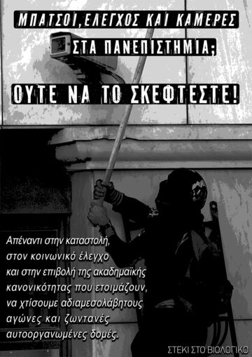 Η πανεπιστημιακή αστυνομία, οι κάμερες και τα πειθαρχικά δεν έρχονται ξαφνικά. Τα τελευταία χρόνια τα μέτρα που παίρνει το πανεπιστήμιο για τη δήθεν ασφάλειά μας είναι συνέχεια της κατεύθυνσης του για την πειθάρχησή μας από φύλακες που καταγράφουν τις διάφορες κινήσεις φοιτητ(ρι)ών μέσα στο campus, τα λουκέτα στα άδεια κτίρια και τα κλειδώματα στις εξωτερικές εισόδους. Αντιλαμβανόμαστε ότι αυτά τα μέτρα δεν ήρθαν για να μας προστατεύσουν αλλά για να καταστείλουν οποιαδήποτε δράση μας δεν ακολουθεί τα πρότυπα της ομαλής λειτουργίας που το κράτος και το κεφάλαιο προσπαθούν να επιβάλλουν. Ασφαλείς αισθανόμαστε στα ζωντανά και ανοιχτά πανεπιστήμια όπου μπορούμε να συναντηθούμε.