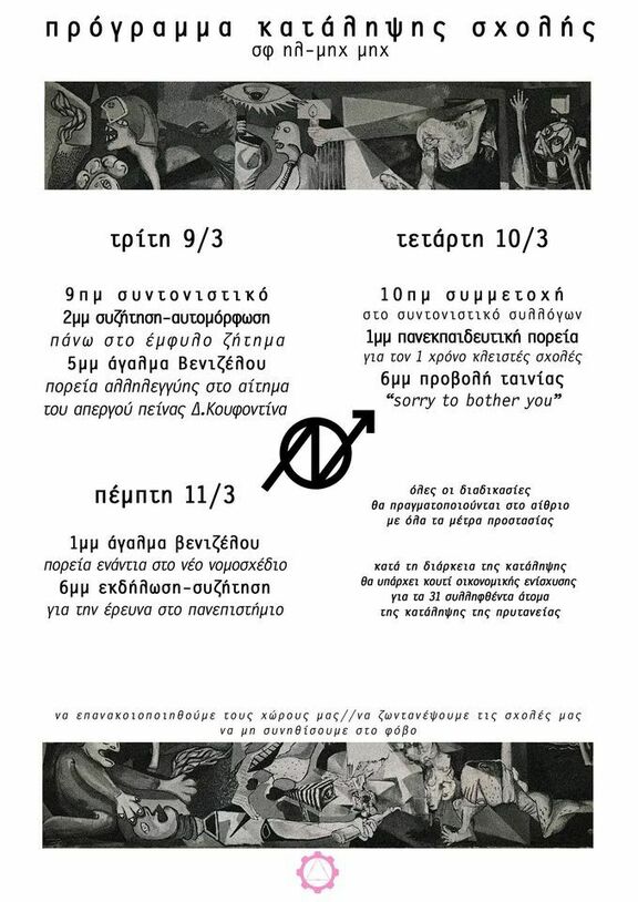 Απέναντι στην καταστολή, στον κοινωνικό έλεγχο και στη επιβολή της ακαδημαϊκής κανονικότητας που μας ετοιμάζουν χτίζουμε αδιαμεσολάβητους αγώνες και ζωντανές αυτοοργανωμένες δομές. Η απάντηση σε κοινωνικά προβλήματα είναι κοινωνική και πολιτική, όχι επιχειρησιακή και κατασταλτική. Θα προασπίσουμε τους χώρους μας απέναντι σε κράτος και τους μηχανισμούς του. Σε εποχές που ο έλεγχος και η καταπίεση κυριαρχούν, οι καταλήψεις είναι ορμητήρια κοινωνικής - πολιτικής απειθαρχίας και αγώνα.