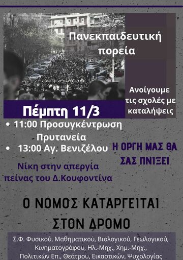 Πέμπτη 11/3, Πανεκπαιδευτική Πορεία 13:00 άγαλμα Βενιζέλου, με προσυγκέντρωση στις 11:00 στην Πρυτανεία