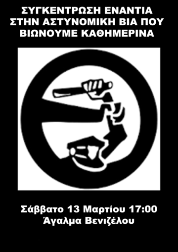 Αυτά είναι γεγονότα που μπορούν να συμβούν σε κάθε γειτονιά. Για αυτό το λόγο καλούμε όλες και όλους να συγκεντρωθούμε το Σάββατο 13 Μαρτίου στις 17:00 στο άγαλμα Βενιζέλου και να δώσουμε ένα ηχηρό μήνυμα στην κυβέρνηση ότι η αστυνομοκρατία δεν θα περάσει!