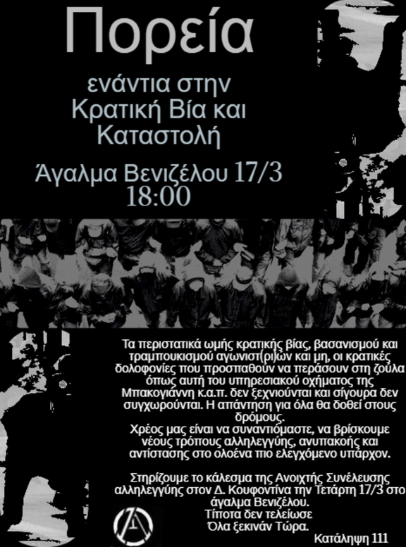 Ο κρατικός μηχανισμός οχυρώνεται μπροστά στον φόβο αναταραχών που θα επιφέρουν οι επικείμενες κοινωνικές κρίσεις. Προετοιμάζει ένα αστικό πεδίο πανοπτικού αρχιτεκτονικού τύπου, με μπάτσους σε κάθε πιθανή γωνία, σε κάθε ''εστία ανομίας και αγώνα'', προσπαθώντας έτσι να ελέγξει το ανεξέλεγκτο και να μπλοκάρει τον εξεγερτικό χείμαρρο πριν ορμήσει και τον καταπνίξει. Οι πρώτες ενδείξεις του κατασταλτικού μένους έχουν από καιρό φανεί καθώς η νέα κανονικότητα έχει εγκαθιδρυθεί και με το παραπάνω και η ρητορική περί "μεμονωμένων περιστατικών αυθαιρεσίας" δεν αποτελεί πλέον έναν ικανοποιητικό μανδύα κάλυψης των αντιεξεγερτικών μέτρων ασφαλείας που λαμβάνουν χώρα. Όλα αυτά δίνουν χώρο στα σκουπίδια του Χρυσοχοίδη να νομίζουν πως είναι στο απυρόβλητο και πως μπορούν να εξασκούν το μένος τους ελεύθερα και χωρίς να φυλάν τα νώτα τους. Το πλήρωμα του χρόνου όμως φτάνει και η Νέα Σμύρνη, οι αλλεπάλληλες πολύμορφες κινήσεις αλληλεγγύης στον επαναστάτη Δ. Κουφοντίνα, καθώς και τα γεγονότα μετά την εκκένωση της κατειλημμένης πρυτανείας του ΑΠΘ, ήταν μία μικρή γεύση του τι μπορεί να επέλθει από τον εξεγερμένο κόσμο. Τα περιστατικά ωμής κρατικής βίας, βασανισμού και τραμπουκισμού αγωνιστ(ρι)ών και μη, οι κρατικές δολοφονίες που προσπαθούν να περάσουν στη ζούλα όπως αυτή του υπηρεσιακού οχήματος της Μπακογιάννη κ.α.π. δεν ξεχνιούνται και σίγουρα δεν συγχωρούνται. Η απάντηση για όλα θα δοθεί στους δρόμους. Χρέος μας είναι να συναντιόμαστε, να βρίσκουμε νέους τρόπους αλληλεγγύης, ανυπακοής και αντίστασης στο ολοένα πιο ελεγχόμενο υπάρχον.