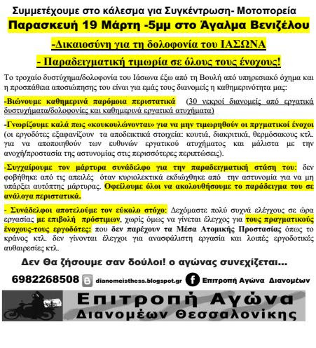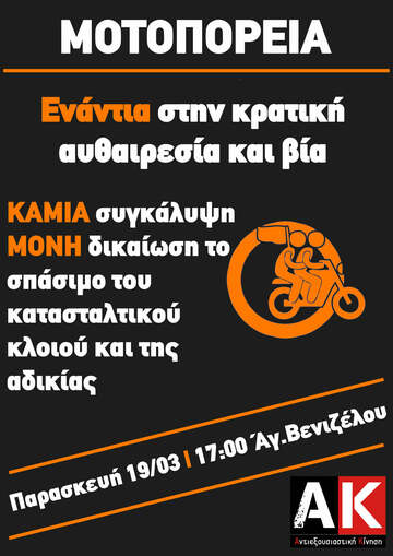 Συγκέντρωση-Μοτοπορεία : Παρασκευή 19/03 17:00 Άγαλμα Βενιζέλου.