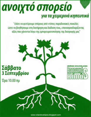 ελάτε να φυτέψουμε σπόρους από ντόπιες παραδοσιακές ποικιλίες ώστε να βοηθήσουμε στη διατήρηση και διάδοση τους επαναπροσδιορίζοντας αξίες που χάνονται λόγω της εμπορευματοποίησης της διατροφής μας.