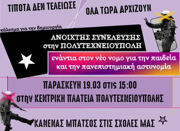 Κάλουμε φοιτήτ(ρι)ες, εργαζόμενους, μεταπτυχιακούς, υποψήφιους ΥΔ, ερευνητές, εστιακές και κόσμο της ευρύτερης γειτονιάς για τη δημιουργία Ανοιχτής Συνέλευσης στην Πολυτεχνειούπολη ενάντια στον νέο νόμο για την παιδεία και την πανεπιστημιακή αστυνομία.