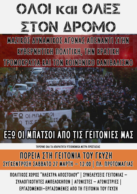 Καλούμε όλη την γειτονιά, κάθε εργαζόμενο/η, κάθε προοδευτικό πολίτη, κάθε νέο και νέα που βιώνει τη βία της εκμετάλλευσης, της φτώχειας, της ανεργίας, της κρατικής τρομοκρατίας, να συγκεντρωθεί και να διαδηλώσει μαζί μας, σαν μια γροθιά, απέναντι στη πολιτική της κυβέρνησης, την κρατική τρομοκρατία, τον κοινωνικό κανιβαλισμό και με βαθιά πίστη πως δεν υπάρχουν κοινοβουλευτικοί σωτήρες αλλά ότι μόνο με το δικό μας μπόι και τους αγώνες μας μπορούμε να δώσουμε συλλογική διέξοδο απέναντι στην πολιτική του συστήματος.