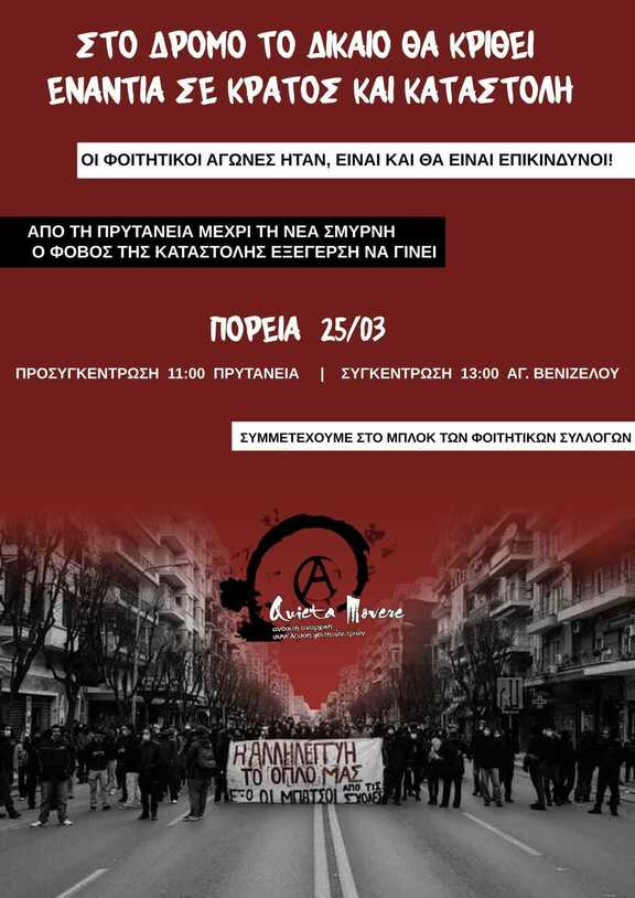 Αφετηριακά είναι πολύ σημαντικό να παραμείνει γιατί για εμάς σε κάθε αγώνα αυτό που θεωρούμε υψίστης σημασίας είναι η συνέπεια στη θεωρία και την πράξη. Εδώ και τόσες Πέμπτες συνεχόμενα το φοιτητικό κίνημα έχει δείξει ότι έχει καταφέρει να διεκδικεί, να αγωνίζεται και να κερδίζει. Από την πρώτη Πέμπτη με την ολιγομελή αλλά θαρραλέα συγκέντρωση μέχρι τις μεγαλειώδεις τελευταίες κινητοποιήσεις αυτό που έγινε ευδιάκριτο σε όλους είναι πως ο συλλογικός αγώνας μπορεί να ξεπεράσει κάθε εμπόδιο και απαγόρευση.Ο δίκαιος αγώνας δεν εμποδίζεται από καμιά αστυνομία, κανένα στρατό, καμιά πατριωτική αφήγηση. Η 25η είναι μια εθνική εορτή και για εμάς η εθνική ενότητα είναι απλά ένα ανέκδοτο από μεριάς κεφαλαίου. Για εμάς η μοναδική ενότητα είναι ταξική. Για να γίνουμε πιο κατανοητοί ας αναρωτηθούμε τι κοινό έχει ο εργάτης μέσα στα μεταλλωρυχεία με τον Βαγγέλη Μαρινάκη; Προφανώς κανένα. Δεν παλεύουμε για τα συμφέροντα καμίας αστικής τάξης. Μοναδικός μας στόχος είναι η εργατική χειραφέτηση, η κατάργηση δηλαδή κάθε εκμετάλλευσης από άνθρωπο σε άνθρωπο.Για να επιστρέψουμε στο θέμα μας αυτή τη Πέμπτη δεν γίνεται κάτι διαφορετικό ώστε να μη βρεθούμε στο άγαλμα Βενιζέλου και να μην διαδηλώσουμε για τις ζωές μας. Δεν θα ετεροκαθορίσουμε τον αγώνα μας σύμφωνα με τις φιέστες που έχουν καθιερώσει κράτος και κεφάλαιο για δικό τους όφελος. Για να το πούμε πιο απλά ναι πιστεύουμε στην επανάσταση και γι'αυτό δεν θα κάνουμε ούτε βήμα πίσω από όλα όσα μας ανήκουν.Θα παλεύουμε απέναντι σε κάθε τύραννο σε κάθε καταπιεστή απλά όχι στο όνομα μιας επίπλαστης ενότητας αλλά αντιθέτως ότι αίμα είναι να χύσουμε αυτό θα γίνει με μοναδικό γνώμονα την ουσιαστική ελευθερία των ζωών μας.