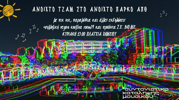 Στα πλαίσια του αγώνα μας εναντίον του νόμου Κεραμέως-Χρυσοχοΐδη και της προσπάθειας επανοικειοποίησης του Α.Π.Θ., ώστε να καταστεί εύφορο έδαφος συνάντησης και σύνδεσης των αγωνιζομένων κομματιών της κοινωνίας, διοργανώνουμε ολοήμερο πικ-νικ στην πλατεία χημείου του ανοιχτού κοινού πάρκου Α.Π.Θ., ενάντια στις περιφράξεις και την αστυνομοκρατία.