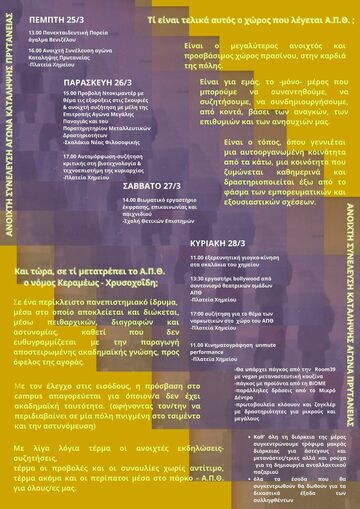 Σε ένα περίκλειστο πανεπιστημιακό ίδρυμα, μέσα στο οποίο αποκλείεται και διώκεται, μέσω πειθαρχικών, διαγραφών και αστυνομίας, καθετί που δεν ευθυγραμμίζεται με την παραγωγή αποστειρωμένης ακαδημαϊκής γνώσης, προς όφελος της αγοράς. Με τον έλεγχο στις εισόδους, η πρόσβαση στο campus απαγορεύεται για όποιον/α δεν έχει ακαδημαϊκή ταυτότητα, αφήνοντας τον/την να περιδιαβαίνει σε μία πόλη πνιγμένη στο τσιμέντο και την αστυνόμευση. Με λίγα λόγια τέρμα οι ανοιχτές εκδηλώσεις-συζητήσεις, τέρμα οι προβολές και οι συναυλίες χωρίς αντίτιμο, τέρμα ακόμα και οι περίπατοι μέσα στο πάρκο - Α.Π.Θ. για όλους/ες μας. Απέναντι σε αυτή τη δυστοπία επανοικειοποιούμαστε το Α.Π.Θ. ανοίγοντάς το στην πόλη.