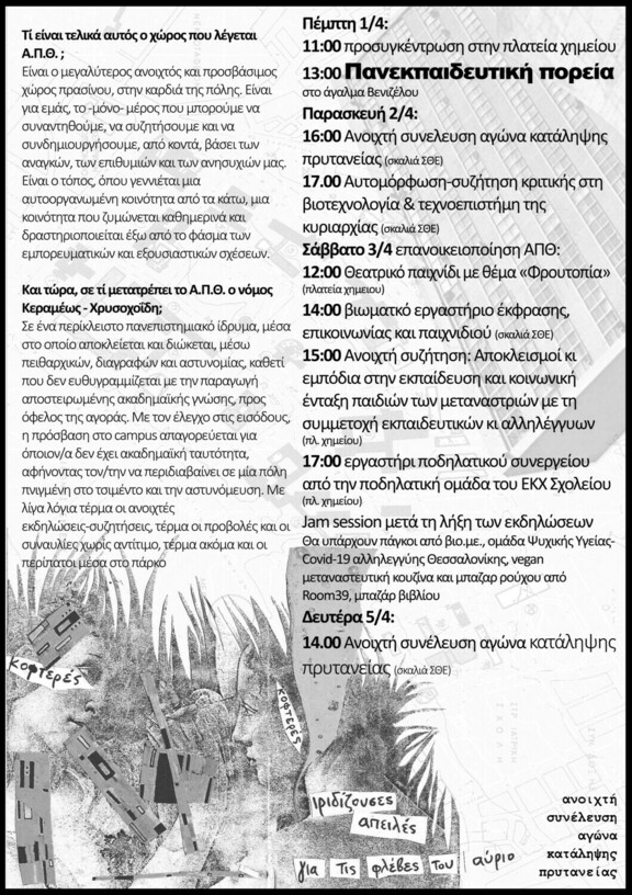 Η εκπαιδευτική αναδιάρθρωση κυριαρχείται σε μεγάλο βαθμό από μια συμβολική και ολομέτωπη επίθεση στα κεκτημένα των φοιτητικών αγώνων. Επιδιώκει να αλλάξει συλλήβδην το κοινωνικό παράδειγμα και την αντίληψη για τις σπουδές και το Άσυλο. Με ρεβανσιστικό τρόπο έρχεται, να ολοκληρώσει το έργο προηγούμενων νομοσχεδίων που ναυάγησαν μπροστά στους δυναμικούς αγώνες των φοιτητών. Η διακαής επιθυμία, ήδη από τα πρώτα χρόνια της μεταπολίτευσης, της επιβολής ανώτατου ορίου φοίτησης και οι διαγραφές φοιτητών επανέρχονται σήμερα με επιθετικούς όρους. Κι εδώ φαίνεται ξανά, η αξιοποίηση της πανδημίας και το lock-down από το κράτος για την προώθηση του νομοθετικού έργου και της κατασταλτικής πολιτικής του με τρόπο όσο το δυνατόν αναίμακτο. Τα πανεπιστήμια είναι κλειστά για σχεδόν ένα έτος, γεγονός που από μόνο του θέτει εμπόδια στη συνάντησή μας και στην δραστηριοποίηση των συλλογικών φοιτητικών διαδικασιών. Ενορχηστρώνει μια βίαιη επίθεση ενάντια στα κεκτημένα του φοιτητικού κινήματος στο κομμάτι των σπουδών και κυρίως ενάντια στην ίδια την πολιτικοποίηση τους. Τελικά, οι εντατικοί ρυθμοί σπουδών, οι διαγραφές, τα πειθαρχικά ορίζονται για να υψώσουν μεγαλύτερους ταξικούς φραγμούς. Οι μπάτσοι μέσα στο campus τοποθετούνται για να επισφραγίσουν την κατάργηση του Ασύλου και στο πλαίσιο της προληπτικής αντιεξέγερσης να επιβάλλουν τον φόβο και την τρομοκράτηση, ώστε να μην σηκώσει κανείς κεφάλι. Κι αν νομίζουν, ότι το καθεστώς της καραντίνας αποτελεί το κατάλληλο momentum για την προώθηση της πιο βίαιης εκπαιδευτικής αναδιάρθρωσης, κάνουν λάθος. Το δίκαιο των φοιτητικών και κοινωνικών αγώνων θα περάσει από πάνω τους.
