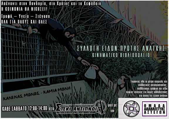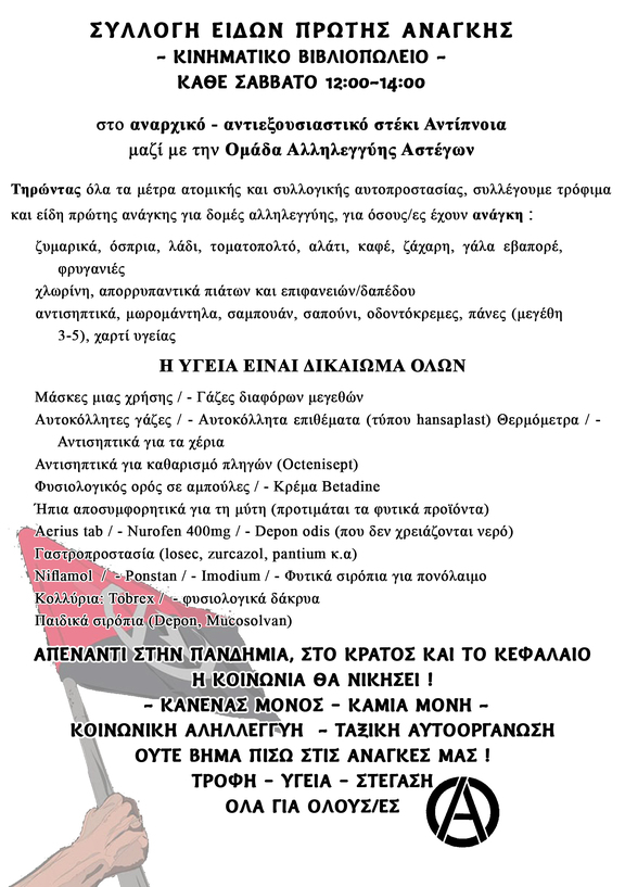 [Σάββατο 3 Απρίλη, 12:00-14:00] ΣΥΛΛΟΓΗ ΕΙΔΩΝ ΠΡΩΤΗΣ ΑΝΑΓΚΗΣ στο α-α στέκι Αντίπνοια, Αριστοβούλου & Πυλάδου, Κ. Πετράλωνα