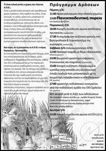 Σε ένα περίκλειστο πανεπιστημιακό ίδρυμα, μέσα στο οποίο αποκλείεται και διώκεται, μέσω πειθαρχικών, διαγραφών και αστυνομίας, καθετί που δεν ευθυγραμμίζεται με την παραγωγή αποστειρωμένης ακαδημαϊκής γνώσης, προς όφελος της αγοράς. Με τον έλεγχο στις εισόδους, η πρόσβαση στο campus απαγορεύεται για όποιον/α δεν έχει ακαδημαϊκή ταυτότητα, αφήνοντας τον/την να περιδιαβαίνει σε μία πόλη πνιγμένη στο τσιμέντο και την αστυνομοκρατία. Με λίγα λόγια τέρμα οι ανοιχτές εκδηλώσεις-συζητήσεις, τέρμα οι προβολές και οι συναυλίες χωρίς αντίτιμο, τέρμα ακόμα και οι περίπατοι μέσα στο πάρκο - Α.Π.Θ. για όλους/ες μας. Απέναντι σε αυτή τη δυστοπία επανοικειοποιούμαστε το Α.Π.Θ. ανοίγοντάς το στην πόλη και στα αγωνιζόμενα κομμάτια της κοινωνίας.