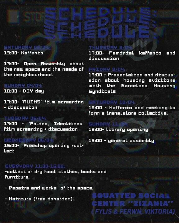 By taking this step, we openly embrace the illegality and precariousness that characterises Viktoria. Indeed, what isn't made illegal here at this point? People who have no other solution than sleeping on the square or inside unused buildings are told it's forbidden and hunted down, day-time hanging out is barely tolerated and organising politically to comes with accepting fines, threats and surveillance - and the cop-state does its best to criminalise it. What is clearly legal however, are the means of the state, the police and the property owners: evictions, increasing rents, and racist harassment. We are squatting today and will keep squatting because we understand it as a key tool in our hands to form new relations and break down these structures. We do not care about staying inside of the lawful boundaries, quite the contrary even. We thrive to challenge, deconstruct and abolish all norms, economic boundaries and borders. We will shape and build community through practices of mutual aid, active solidarity, inclusive and horizontal organization. We will work to reach out to all those in the neighbourhood who want to struggle on such terms and build connections to break the state alienation. We invite individuals and groups to reach out to us. Together we want to break down the divisions instigated and capitalized on by the oppressions of the state and society and bring out the creative and powerful multicultural potential of the neighbourhood. We seek to reassert an antifascist presence and consciousness in the area and challenge the status quo of the balance of power and fear through enabling connection and creation. By choosing to occupy a space that used to be an autonomous squatted archive, in such a general social context, we also seek to rekindle the legacy of squatting, of combativeness and resistance that is part of Viktoria's complex history. We have called ourselves Ζιζάνια because like weeds, we grow and flourish amidst the chaos, against all control, time and time again.