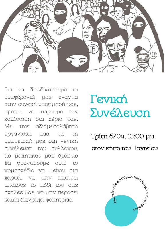 Όλες και όλοι στην γενική συνέλευση του φοιτητικού συλλόγου την Τρίτη, στην 1 μμ, στον κήπο της Παντείου.