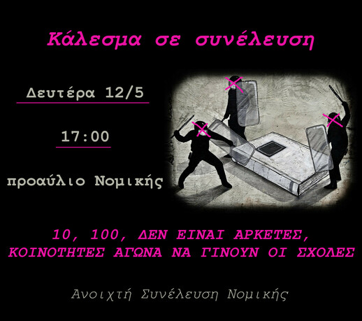 Για τους λόγους αυτούς, καλούμε τη Δευτέρα 5/4 στις 17:00 σε συνέλευση όλων των φοιτητ(ρι)ών και των μεταπτυχιακών και των διδακτορικών, των συλλόγων, των εργαζομένων και των συλλογικοτήτων στο προαύλιο της σχολής.