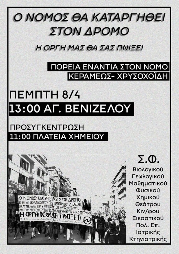 Πορεία ενάντια στο νόμο Κεραμέως - Χρυσοχοΐδη 13:00 Άγαλμα Βενιζέλου, από τους ΣΦ Βιολογικού, Γεωλογικού, Μαθηματικού, Φυσικού, Χημικού, Θεάτρου, Κιν/φου, Εικαστικού, Πολ. Επ., Ιατρικής, Κτηνιατρικής