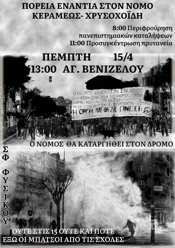 AT THE APPOINTMENT AT 15 WE WILL BE ON THE ROAD IN THE ROADS WE WILL ABUSE THE LAW CALL FOR THE NATIONAL MARKET THURSDAY 15/4 Supporting Aristotle squats and guarding the Asylum: 8:00 Pre-gathering: 11 am occupied Rector Gathering: 1 pm Venizelos Statue We support Student Club blocks. It's all started. Not a step back. In the position of an epilogue there is only the dynamic preparation of the continuity that has already begun. Students are inside the faculty and the university is alive due to the actions taking place. Student s' self-organization and open frameworks in many faculties have set the race direction for the next period. Our concern now is to continue what we did in the occupation of the rector: to take our lives into our own hands. To meet massively at our schools General Assemblies, participate and create new libertarian regimes, be on the Road again and again. Organization, consistency, faith and radicalization to raise collective and dynamic resistance against state violence and authoritarianism against Kerameos-Chrysochoidis Law. Organization at base, unity in Action. From the Rector to Nea Smyrni, the fear of suppression of Rebellion will take place. Organized at Base by students! Faculty of Struggle! Down with the Kerameos-Chrysochoidis Law! State and rectors Light a wick! Cops see you April 15th! Quieta Movere's full announcement about continuing student games: https://quieta-movere.espivblogs.net/2021/03/…