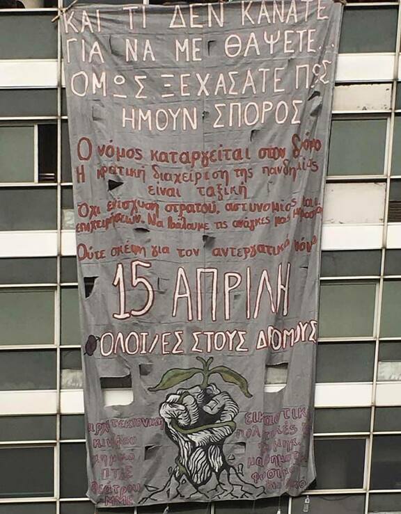 Η καταστολή είναι παντού. Εν μέσω πανδημίας το κράτος δεν κάνει καμία υγειονομική ενέργεια για το κοινό συμφέρον, αλλά την αντιμετωπίζει ως ευκαιρία για να απαντήσει σε όλα τα ανοιχτά ζητήματα με καταστολή. Τα μέτρα "διαχείρισης" όπως lockdown, απαγόρευση συναθροίσεων/κυκλοφορίας, δεν είναι υγειονομικά αλλά υπάρχουν για να κάμψουν κάθε μορφή αντίστασης και να καθιερώνονται νόμοι σαν τους παραπάνω. Έχει εξαγγελθεί από τον Χρυσοχοϊδη ότι στις 15/4 θα εισβάλλει το πρώτο αστυνομικό σώμα στο Α.Π.Θ. Ο χώρος του πανεπιστημίου στον οποίο θα επιτεθεί το κράτος αποτελεί σημείο καταλήψεων και κέντρων αγώνα, όπως και σημείο συνάντησης για όλη την κοινωνία. Σε αυτήν την εξαγγελία θα απαντήσουμε με την παρουσία και την περιφρούρηση του campus από ένστολους κρατικούς δολοφόνους.