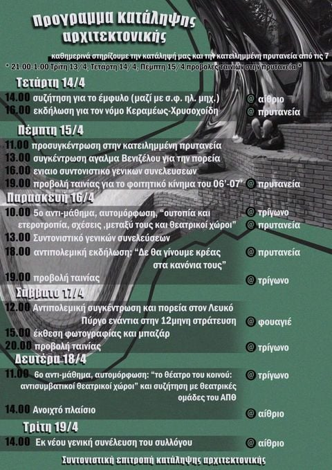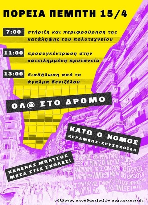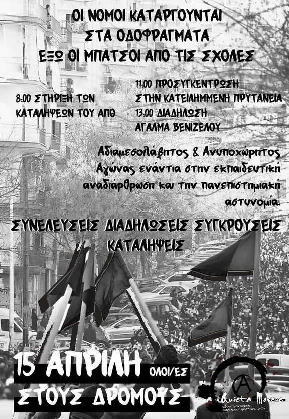 AT THE APPOINTMENT AT 15 WE WILL BE ON THE ROAD IN THE ROADS WE WILL ABUSE THE LAW CALL FOR THE NATIONAL MARKET THURSDAY 15/4 Supporting Aristotle squats and guarding the Asylum: 8:00 Pre-gathering: 11 am occupied Rector Gathering: 1 pm Venizelos Statue We support Student Club blocks. It's all started. Not a step back. In the position of an epilogue there is only the dynamic preparation of the continuity that has already begun. Students are inside the faculty and the university is alive due to the actions taking place. Student s' self-organization and open frameworks in many faculties have set the race direction for the next period. Our concern now is to continue what we did in the occupation of the rector: to take our lives into our own hands. To meet massively at our schools General Assemblies, participate and create new libertarian regimes, be on the Road again and again. Organization, consistency, faith and radicalization to raise collective and dynamic resistance against state violence and authoritarianism against Kerameos-Chrysochoidis Law. Organization at base, unity in Action. From the Rector to Nea Smyrni, the fear of suppression of Rebellion will take place. Organized at Base by students! Faculty of Struggle! Down with the Kerameos-Chrysochoidis Law! State and rectors Light a wick! Cops see you April 15th! Quieta Movere's full announcement about continuing student games: https://quieta-movere.espivblogs.net/2021/03/…