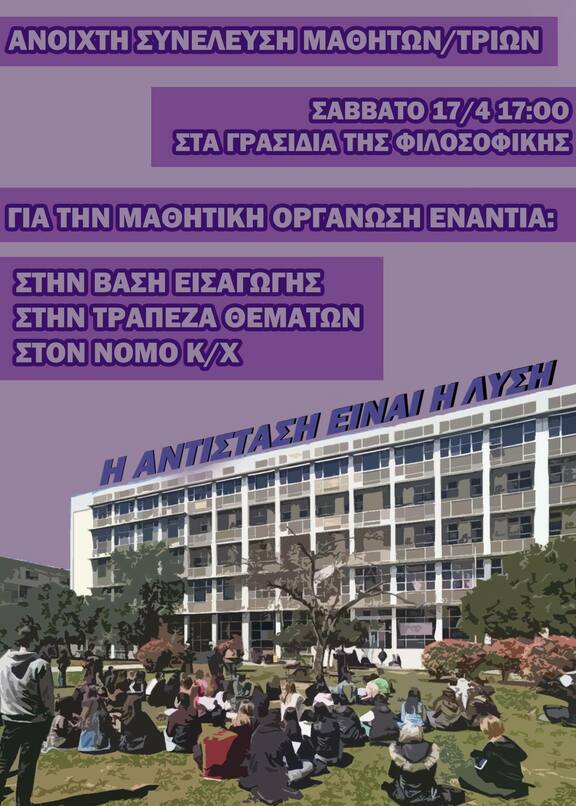 Σε μία προσπάθεια οργάνωσης μαθητικών αντιστάσεων, καλούμε ανοιχτή συνέλευση το Σάββατο 17/4 17:00 στα γρασίδια της Φιλοσοφικής του ΑΠΘ. Στόχος μας είναι η ζύμωση της μαθητικής κοινότητας, η συμμετοχή σε συνελεύσεις και σε εκπαιδευτικές πορείες κάθε Πέμπτη. Το Σάββατο θα συζητηθεί ο τρόπος λειτουργίας της σύνελευσης και οι δράσεις που θέλουμε να υλοποιήσουμε από εδώ και εξής μαζί με νέους/ες μαθητές και μαθήτριες.